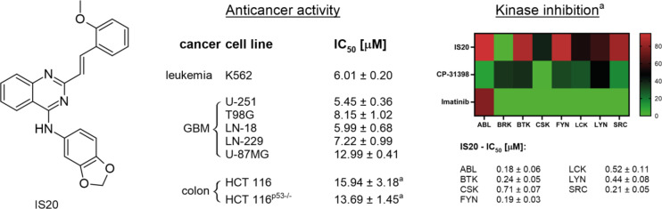 The chemical structure of IS20 (6b) styrylquinazoline, along with its anticancer activity on a panel of cancer cell lines with different