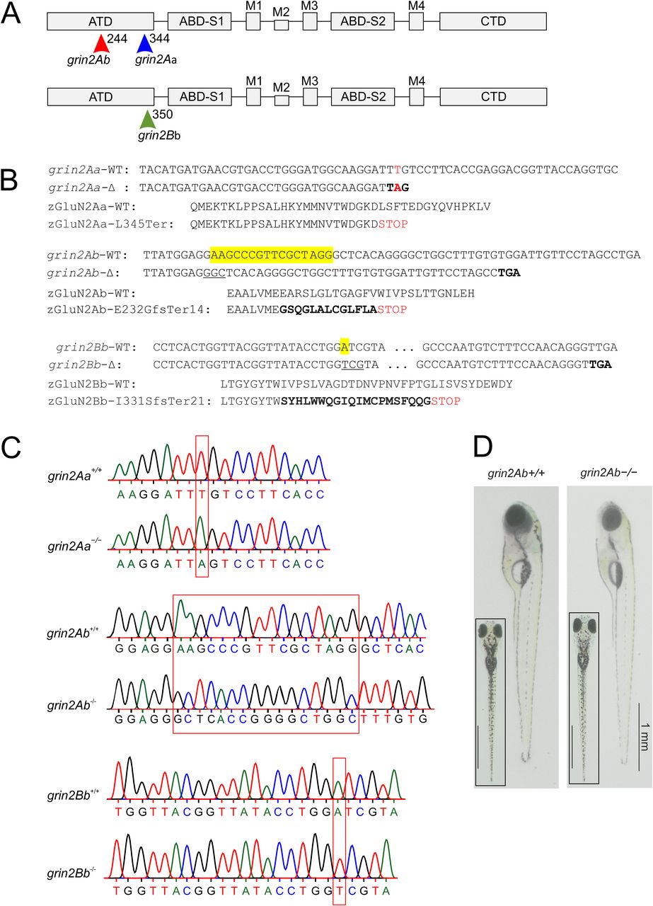 Fig. 3 Locations of zGluN2 mutations resulting in a premature stop codon and protein truncation. A, Schematic representation of the domain structure of a GluN2 subunit. It consists of four domains: the extracellular ATD and S1 and S2 lobes of the ABD; the membrane TMD with transmembrane segments M1, M3, M4, and M2 pore loop forming the ion channel; and the intracellular CTD. In the ATD, arrows indicate the position of grin2Aa mutation (sa14573) and gRNA target sites for grin2Ab and grin2Bb. B, The nucleotide and amino acid sequence alignment of the portion of the ATD of zGluN2Aa wild-type (grin2Aa-WT; zGluN2Aa-WT) and the mutant strain (grin2Aa-Δ; zGluN2Aa-L345Ter; top), zGluN2Ab wild-type (grin2Ab-WT; zGluN2Ab-WT) and the mutant strain (grin2Ab-Δ; zGluN2Ab-E232GfsTer14; middle), and zGluN2Bb wild-type (grin2Bb-WT; zGluN2Bb-WT) and the mutant strain (grin2Bb-Δ; zGluN2Bb-I331SfsTer21; bottom). C, Chromatograms of Sanger sequencing of PCR amplicons of genomic DNA from grin2Aa+/+ and grin2Aa−/− (top), grin2Ab+/+ and grin2Ab−/− (middle), and grin2Bb+/+ and grin2Bb−/− (bottom) larvae. D, Lateral and dorsal (inset) images of representative 6 dpf wild-type (grin2Ab+/+) and grin2Ab−/− larvae. For viability of larvae with mono- and biallelic deletion of grin2Aa, grin2Ab, or both genes at 6 dpf, see Extended Data Figure 3-1. For growth of the grin2Aa−/−, grin2Ab−/−, and grin2A−/− mutant fish during development, see Extended Data Figure 3-2.