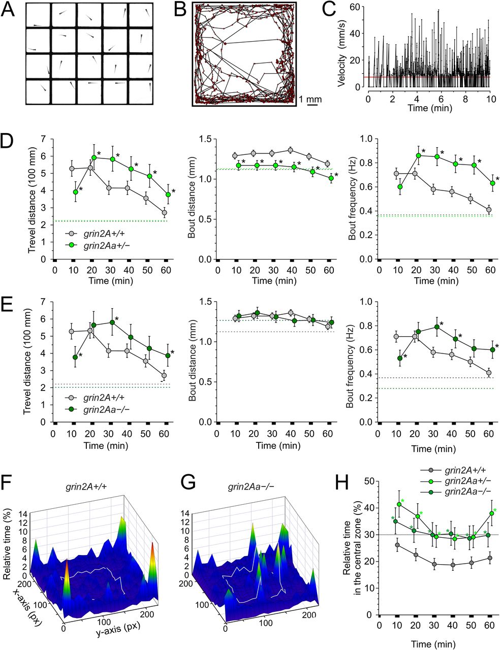 Fig. 4 Effects of grin2Aa deletion on larval swimming behavior and thigmotaxis. A, Photograph of a multiwell chamber used to simultaneously assess the spontaneous swimming behavior of 20 larvae (6 dpf). Larvae in the experiment were progeny of grin2Aa+/− intercrosses with the genotype determined after the behavioral experiment. B, The graph shows the sample trajectory of a grin2Aa+/+ larva as assessed during the first 10 min interval. Data points were acquired at 50 Hz. C, The graph shows the velocity of a grin2A+/+ larva assessed at 20 ms intervals. The red line indicates the velocity threshold for locomotor activity detection (see Materials and Methods). The MTD, MBD, and MBF of grin2Aa+/− and grin2A+/+ larvae (D) and grin2Aa−/− and grin2A+/+ larvae (E) are compared. Dashed lines correspond to mean values of the measured parameters at steady state, 2–3 h after the placement of larvae into the experimental chamber. For steady-state swimming parameters assessed 2–3 h after the larvae were placed in the experimental chambers, see Extended Data Figure 4-1. Representative heat maps for the relative time spent by grin2A+/+ (F) and grin2Aa−/− (G) larvae in 0.454 × 0.454 mm area bins (10 × 10 pixels) over 20 min of recording (30–50 min), indicated by color coding. The central zone (5.5 × 5.5 mm) used to assess thigmotaxis is outlined by a gray line. H, Comparison of thigmotaxis measured as the relative time spent by grin2A+/+, grin2Aa+/−, and grin2Aa−/− larvae in the central zone. The analysis was performed on the same larvae used to study locomotion. The dotted line indicates the level of randomness (30%). Data are expressed as mean ± 95% confidence interval of travel distance, bout distance, and bout frequency (D, E), and the relative time spent by larvae in the central zone (H) in episodes lasting 10 min; * indicates significant differences in genotype as assessed by ANOVA followed by the LSD post hoc test (grin2A+/+, n = 582; grin2Aa+/−, n = 429; grin2Aa−/−, n = 216). grin2Aa+/− versus grin2A+/+, travel distance genotype, p < 0.001; time, p < 0.001; bout distance genotype, p < 0.001; time, p < 0.001; bout frequency, genotype, p < 0.001; time, p < 0.001; and relative time larvae spent in the central zone genotype, p < 0.001; time, p < 0.001. grin2Aa−/− versus grin2A+/+, travel distance genotype, p = 0.0056; time, p < 0.001; bout distance genotype, p = 0.81; time p = 0.013; bout frequency, genotype, p = 0.001; time, p < 0.001; and relative time spent by larvae in the central zone genotype, p < 0.001; time, p = 0.013.