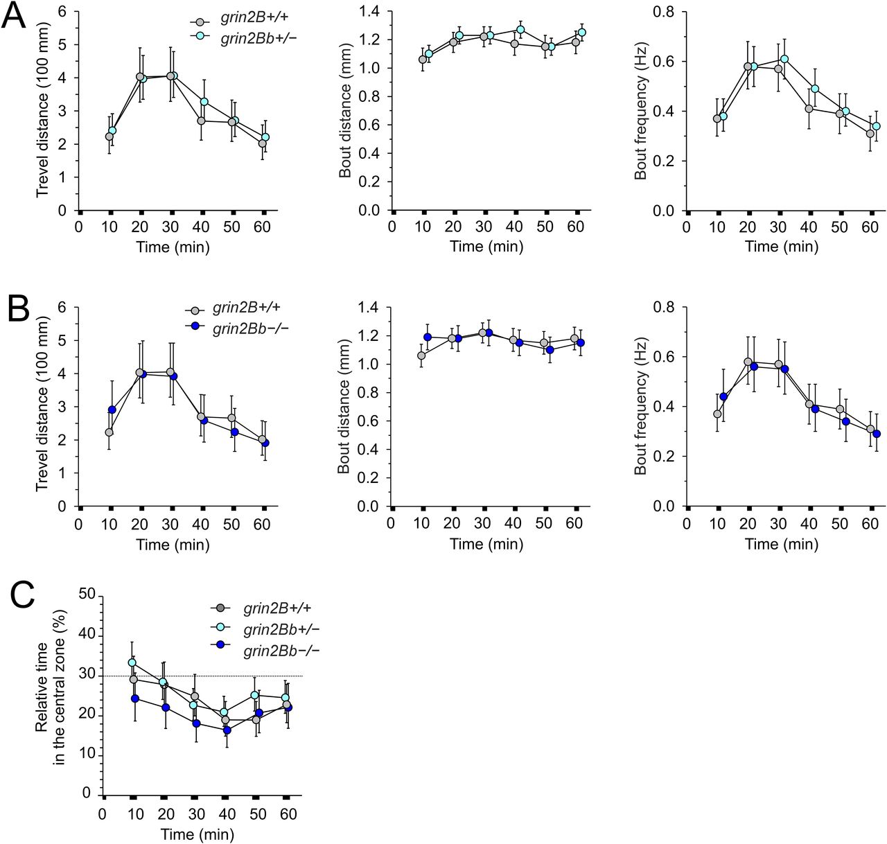 Fig. 6 No effect of grin2Bb deletion on larval locomotor activity and thigmotaxis. Comparison of the MTD, MBD, and MBF assessed in grin2Bb+/− (A) and grin2Bb−/− (B) larvae compared with grin2B+/+ larvae (6 dpf). C, Thigmotaxis measured as the relative time spent in the central zone by grin2Bb+/− and grin2Bb−/− larvae compared with grin2B+/+ larvae. The analysis of thigmotaxis was performed on the same larvae used to study locomotion. The dotted line indicates the level of randomness (30%). Data are expressed as mean ± 95% confidence interval of travel distance, bout distance, and bout frequency (A, B) and the relative time spent by larvae in the central zone (C); data were analyzed by ANOVA followed by the post hoc LSD tests (grin2B+/+, n = 198; grin2Bb+/−, n = 288; grin2Bb−/−, n = 144). grin2Bb+/− versus grin2B+/+, travel distance genotype, p = 0.18; time, p < 0.001; bout distance genotype, p = 0.37; time, p < 0.003; bout frequency genotype, p = 0.13; time, p < 0.002; the relative time larvae spent in the central zone genotype, p = 0.23; time, p < 0.002. grin2Bb−/− versus grin2B+/+, travel distance genotype, p = 0.97; time, p < 0.001; bout distance genotype, p = 0.53; time, p = 0.35; bout frequency genotype, p = 0.83; time, p < 0.001; the relative time larvae spent in the central zone genotype, p = 0.11; time, p = 0.23.