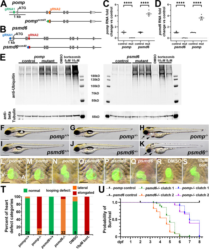 A. Schematic illustrating pomp gene structure and CRISPR deletion. pomp exons are shown as boxes and the start codon is labeled. Guide RNA target sites are labeled in green and orange. DNA sequencing of the pompscm41 strain showed the pomp gene sequence between the two guide RNA sites has been deleted. B. Schematic illustrating psmd6 gene structure and CRISPR deletion. psmd6 exons are shown as boxes and the start codon is labeled. Guide RNA target sites are labeled in blue and red. DNA sequencing of the psmd6scm40 strain showed the psmd6 gene sequence between the two guide RNA sites has been deleted. C.-D. qRT-PCR analysis of (C) pomp and (D) psmd6 expression in 4 dpf phenotyped pomp and psmd6 control (presumed +/+ and +/-) or mutant (mut, presumed -/-) larvae. Each dot represents a replicate batch of embryos. Bars represent mean +/- SEM. N = 5 (control) or 4 (mutant) replicates. Each replicate consists of 10-20 embryos. **** P < 0.0001. E. Western analysis using anti-Ubiquitin and anti-beta Tubulin (as a loading control). Larvae from pomp and psmd6 clutches were phenotyped as control (presumed +/+ and +/-) or mutant (presumed -/-) larvae at 4 dpf and collected for lysates. Lysates were prepared from 3 replicate pools of animals for each condition, with n = 20 animals per replicate. Larvae from bortezomib or DMSO control treatments were collected at 4 dpf, with n = 20 animals per lysate. Molecular weight markers are shown. F.-K. Images of live 4 dpf larvae. The asterisk in F marks the swim bladder. Arrowheads in H, K point to heart cavity swelling/edema. Black arrows in H, K point to reduced craniofacial structures. White arrows in H, K point to areas of blood pooling. Embryos were genotyped. N = 3 pomp+/+, 12 pomp+/-, 9 pomp-/-, 4 psmd6+/+, 8 psmd6+/-, 6 psmd6-/-. Scale bars = 500 μm. L.-Q. Ventral views of hearts labeled with myl7:EGFP in live 4 dpf larvae with pigment inhibited. R.-S. Ventral views of hearts labeled with myl7:EGFP in formaldehyde-fixed 4 dpf larvae with pigment bleached. Scale bars = 100 μm. V, ventricle. A, atrium. T. Graph showing frequencies of heart defect categories observed in 4 dpf larvae. The total number of larvae scored is given at the base of the columns. Embryos were genotyped. U. Survival plot of two independent clutches each of pomp and psmd6. Dead embryos were collected and fixed over the course of the experiment; all embryos were genotyped at the conclusion of the experiment. Control (+/+ and +/-) curves are shown for only one clutch of each line; similar results were seen with the second clutch of controls for each line. Numbers of animals per clutch: pomp clutch 1: 40 +/+ , 100 +/-, 52 -/-; pomp clutch 2: 44 +/+ , 93 +/-, 61 -/-; psmd6 clutch 1: 60 +/+ , 107 +/-, 55 -/-; psmd6 clutch 2: 27 +/+ , 61 +/-, 22 -/-.