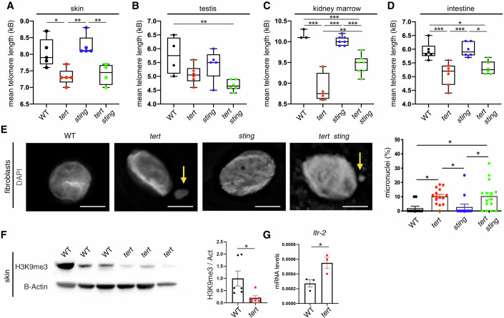 (A) Quantification of mean telomere length measured by TRF analysis in the skin (nWT = 5, ntert-/- = 5, nsting-/- = 5, ntert-/- sting-/- = 4, WT vs tert-/-p = 0.017, tert-/- vs sting-/-p = 0.002, sting-/- vs tert-/- sting-/-p = 0.008). (B) Quantification of mean telomere length measured by TRF analysis in the testis (nWT = 4, ntert-/- = 6, nsting-/- = 5, ntert-/- sting-/- = 6, WT vs tert-/- sting-/-p = 0.008). (C) Quantification of mean telomere length measured by TRF analysis in the kidney marrow (nWT = 3, ntert-/- = 4, nsting-/- = 7, ntert-/- sting-/- = 7, WT vs tert-/-p = 0.000003, WT vs tert-/- sting-/-p = 0.0008, tert-/- vs sting-/-p = 0.000001, sting-/- vs tert-/- sting-/-p = 0.0005, tert-/- vs tert-/- sting-/-p = 0.003). (D) Quantification of mean telomere length measured by TRF analysis in the intestine (nWT = 6, ntert-/- = 6, nsting-/- = 6, ntert-/- sting-/- = 6, WT vs tert-/-p = 0.0007, WT vs tert-/- sting-/-p = 0.015, tert-/- vs sting-/-p = 0.0004, sting-/- vs tert-/- sting-/-p = 0.008). In each boxplot (A–D), the boxes represent the interquartile range (IQR; 25th to 75th percentile). Inside each box, the horizontal line indicates the median. The whiskers extend to the most extreme data points (minima and maxima) within 1.5 × IQR from the quartiles. (E) Representative immunofluorescence images and quantifications of MN formation in the fibroblasts derived from skin (nWT = 1, ntert-/- = 1, nsting-/- = 1, ntert-/- sting-/- = 1, WT vs tert-/-p = 0.040, WT vs tert-/- sting-/-p = 0.034, tert-/- vs sting-/-p = 0.047, sting-/- vs tert-/- sting-/-p = 0.040). The yellow arrows point at the micronuclei. Scale bar = 5 µm. (F) Representative western blot images and quantification of H3K9me3 in the skin (nWT = 6, ntert-/- = 6, WT vs tert-/-p = 0.032). (G) RT-qPCR analysis of ltr-2 gene expression (nWT = 3, ntert-/- = 3, WT vs tert-/-p = 0.038). Data in Fig. 1E–G are presented as the mean ± s.e.m.; *p < 0.05; **p < 0.01, ***p < 0.001, using a one-way ANOVA and post hoc Tukey test (panel A–E), or unpaired t-test (panel F, G). Source data are available online for this figure.