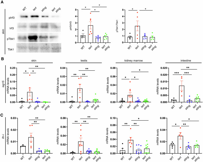 (A) Representative western blot images and quantification of downstream targets of cGAS-STING pathway (nWT = 4–5, ntert-/- = 5–6, nsting-/- = 5–7, ntert-/- sting-/- = 5, p-Irf3/Irf3: WT vs tert-/- p = 0.049, tert-/- vs tert-/- sting-/- p = 0.011; p-Tbk1/Tbk1: WT vs tert-/- p = 0.035, tert-/- vs sting-/- p = 0.002, tert-/- vs tert-/- sting-/- p = 0.042). (B) RT-qPCR analysis of isg15 gene expression in the skin, testis, kidney marrow and intestine (nWT = 5–6, ntert-/- = 4–8, nsting-/- = 5–8, ntert-/- sting-/- = 7–9, skin: WT vs tert-/- p = 0.024, sting-/- vs tert-/- p = 0.011, N = 5–7, tert-/- vs tert-/- sting-/- p = 0.007; testis: WT vs tert-/- p = 0.001, sting-/- vs tert-/- p = 0.001, tert-/- vs tert-/- sting-/- p = 0.002; kidney marrow: N = 6–9, WT vs tert-/- p = 0.045, sting-/- vs tert-/- p = 0.022, tert-/- vs tert-/- sting-/- p = 0.019; intestine: WT vs tert-/- p = 0.0008, sting-/- vs tert-/- p = 0.0007, tert-/- vs tert-/- sting-/- p = 0.001). (C) RT-qPCR analysis of ifn-i gene expression in the skin, testis, kidney marrow and intestine (nWT = 4–6, ntert-/- = 5–8, nsting-/- = 5–8, ntert-/- sting-/- = 6–9, skin: sting-/- vs tert-/- p = 0.004, tert-/- vs tert-/- sting-/- p = 0.002; testis: WT vs tert-/- p = 0.003, sting-/- vs tert-/- p = 0.003, tert-/- vs tert-/- sting-/- p = 0.003; kidney marrow: WT vs tert-/- p = 0.008, sting-/- vs tert-/- p = 0.004, tert-/- vs tert-/- sting-/- p = 0.011; intestine: WT vs tert-/- p = 0.020, sting-/- vs tert-/- p = 0.005, tert-/- vs tert-/- sting-/- p = 0.014). Data were presented as the mean ± s.e.m.; *p < 0.05; **p < 0.01, ***p < 0.001, using a one-way ANOVA and post hoc Tukey test. Source data are available online for this figure.