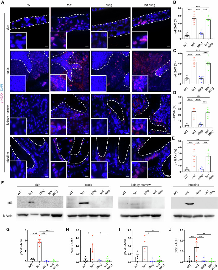 (A) Representative immunofluorescence images of DNA damage. Scale bar = 10 µm. (B) Quantification of DNA damage in skin (nWT = 6, ntert-/- = 6, nsting-/- = 6, ntert-/- sting-/- = 6; WT vs tert-/- p = 0.00001, sting-/- vs tert-/- p = 0.000001, WT vs tert-/- sting-/- p = 0.000001, sting-/- vs tert-/- sting-/- p = 0.000003). (C) Quantification of DNA damage in testis (nWT = 6, ntert-/- = 6, nsting-/- = 6, ntert-/- sting-/- = 6, N = 5–6, WT vs tert-/- p = 0.000001, sting-/- vs tert-/- p = 0.000001, WT vs tert-/- sting-/- p = 0.000001, sting-/- vs tert-/- sting-/- p = 0.000002). (D) Quantification of DNA damage in kidney marrow (nWT = 6, ntert-/- = 6, nsting-/- = 6, ntert-/- sting-/- = 6; WT vs tert-/- p = 0.00004, sting-/- vs tert-/- p = 0.0001, WT vs tert-/- sting-/- p = 0.0001, sting-/- vs tert-/- sting-/- p = 0.0003). (E) Quantification of DNA damage in intestine (nWT = 5, ntert-/- = 5, nsting-/- = 5, tert-/- sting-/- = 5; WT vs tert-/- p = 0.006, sting-/- vs tert-/- p = 0.008, WT vs tert-/- sting-/- p = 0.007, sting-/- vs tert-/- sting-/- p = 0.0095). (F) Representative western blot images of p53. (G) Quantification of p53 levels in the skin (nWT = 4, ntert-/- = 4, nsting-/- = 4, ntert-/- sting-/- = 4, WT vs tert-/- p = 0.000001, sting-/- vs tert-/- p = 0.000001, tert-/- vs tert-/- sting-/- p = 0.000001). (H) Quantification of p53 levels in the testis (nWT = 4, ntert-/- = 4, nsting-/- = 4, ntert-/- sting-/- = 4, WT vs tert-/- p = 0.050, tert-/- vs tert-/- sting-/- p = 0.048). (I) Quantification of p53 levels in the kidney marrow (nWT = 4, ntert-/- = 4, nsting-/- = 4, ntert-/- sting-/- = 4, sting-/- vs tert-/- p = 0.017, tert-/- vs tert-/- sting-/- p = 0.022). (J) Quantification of p53 levels in the intestine (nWT = 5, ntert-/- = 5, nsting-/- = 5, ntert-/- sting-/- = 5, WT vs tert-/- p = 0.009, sting-/- vs tert-/- p = 0.006, tert-/- vs tert-/- sting-/- p = 0.006). Data were presented as the mean ± s.e.m.; *p < 0.05; **p < 0.01, ***p < 0.001, using a one-way ANOVA and post hoc Tukey test. Source data are available online for this figure.