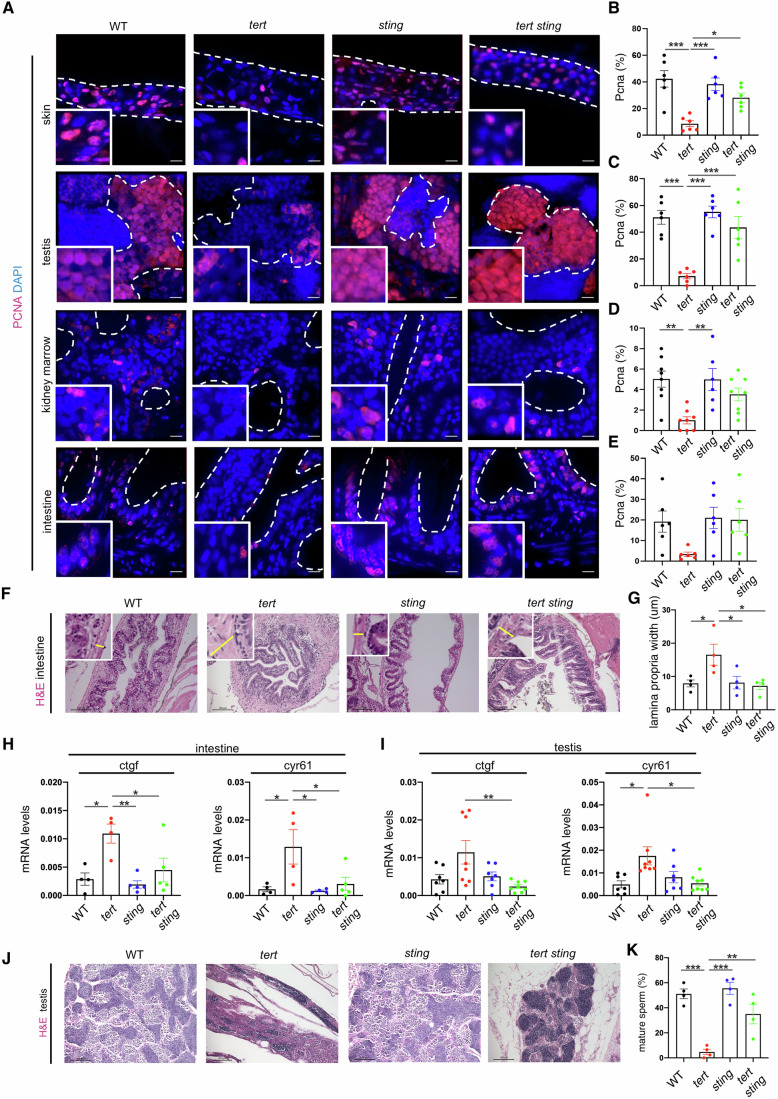 (A) Representative immunofluorescence images of proliferation and apoptosis. Scale bar = 10 µm. (B) Quantification of proliferation in the skin (nWT = 5, ntert-/- = 6, nsting-/- = 6, ntert-/- sting-/- = 6 WT vs tert-/- p = 0.0001, sting-/- vs tert-/- p = 0.0006, tert-/- vs tert-/- sting-/- p = 0.024). (C) Quantification of proliferation in the testis (nWT = 6, ntert-/- = 6, nsting-/- = 6, ntert-/- sting-/- = 6, WT vs tert-/- p = 0.00007, sting-/- vs tert-/- p = 0.00002, tert-/- vs tert-/- sting-/- p = 0.0006). (D) Quantification of proliferation in the kidney marrow (nWT = 8, ntert-/- = 8, nsting-/- = 6, ntert-/- sting-/- = 8, WT vs tert-/- p = 0.002, sting-/- vs tert-/- p = 0.004). (E) Quantification of proliferation in the intestine (nWT = 6, ntert-/- = 5, nsting-/- = 6, ntert-/- sting-/- = 8). (F) Representative hematoxylin eosin staining of intestine, insets with yellow lines representative of lamina propria thickness. Scale bar = 100 µm. (G) Quantification of lamina propria width (nWT = 4, ntert-/- = 4, nsting-/- = 4, ntert-/- sting-/- = 4, WT vs tert-/- p = 0.042, sting-/- vs tert-/- p = 0.048). (H) RT-qPCR analysis of YAP-TAZ pathway targets in the intestine (nWT = 4, ntert-/- = 4, nsting-/- = 5, ntert-/- sting-/- = 5, ctfg: WT vs tert-/- p = 0.016 sting-/- vs tert-/- p = 0.005, tert-/- vs tert-/- sting-/- p = 0.044; cyr61: WT vs tert-/- p = 0.030, sting-/- vs tert-/- p = 0,023, tert-/- vs tert-/- sting-/- p = 0.046). (I), RT-qPCR analysis of YAP-TAZ pathway targets in the testis (nWT = 7, ntert-/- = 8, nsting-/- = 6–7, tert-/- sting-/- = 7–8, cftg: tert-/- vs tert-/- sting-/- p = 0.008, cyr61: tert-/- vs tert-/- sting-/- p = 0.011). (J) Representative hematoxylin eosin staining of testis. Scale bar = 100 µm. (K) Quantification of mature sperm area (nWT = 4, ntert-/- = 4, nsting-/- = 4, ntert-/- sting-/- = 4, WT vs tert-/- p = 0.0002, sting-/- vs tert-/- p = 0.00007, tert-/- vs tert-/- sting-/- p = 0.006). All data were presented as the mean ± s.e.m.; *p < 0.05; **p < 0.01, ***p < 0.001, using a one-way ANOVA and post hoc Tukey test. Source data are available online for this figure.