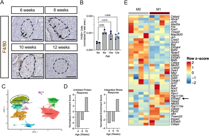 Fig. 1 ISR regulates macrophage translation in T1D pathogenesis. A Representative images of pancreata from female NOD mice overtime stained for F4/80 (macrophage marker; brown) and counterstained with hematoxylin (blue). Dotted lines indicate islets and arrows indicate macrophages. Scale bars: 100 μm. B Quantification of F4/80 + cells in islet area; n = 3–4 biological replicates. C UMAP embeddings of a reanalysis of scRNA-Seq of islets from female NOD mice. D GSEA of the macrophage cell population identified in C showing normalized enrichment scores for Hallmark Gene Set: Unfolded Protein Response (left panel) and GO Biological Processes: Integrated Stress Response Signaling (right panel). E Heatmap of gene expression of ISR-associated genes in M0 and M1 polarized BMDMs derived from NOD mice. Arrows point to key genes of ISR kinases. Statistical tests: 1-way ANOVA with Tukey post-hoc test: B. Data are represented as mean ± SEM