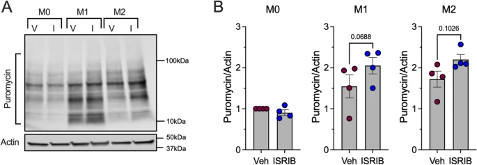 Fig. 3 ISR alters new protein translation in macrophages. A Representative immunoblot of puromycin incorporation normalized to actin in vehicle or 50 nM ISRIB treated unpolarized (M0) and polarized (M1 or M2) BMDMs isolated from 8-week-old male C57B/6J mice; n = 4 biological replicates. B Quantification of immunoblots in I. Data is normalized to M0 vehicle. Statistical tests: Paired t-tests: B. Data are represented as mean ± SEM