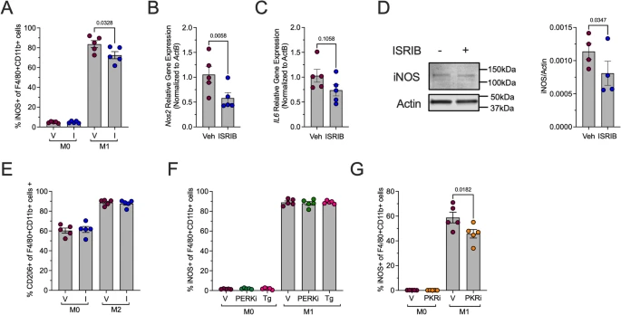 Fig. 4 ISR and PKR inhibition reduces proinflammatory macrophages. BMDMs from male 8-week-old C57Bl/6J mice were unpolarized (M0) or polarized to M1-like proinflammatory macrophages with and without 50 nM ISRIB. A Flow cytometry analysis of iNOS + cells as a percentage of F4/80 + CD11b + cells; n = 5 biological replicates. B Relative Nos2 mRNA levels measured by qRT-PCR normalized to Actb in M1-polarized BMDMs; n = 5 biological replicates. C Relative Il6 mRNA levels measured by qRT-PCR normalized to Actb in M1-polarized BMDMs; n = 5 biological replicates. D Representative immunoblot showing iNOS and actin in M1-polarized BMDMs (left panel) and quantification of iNOS levels; n = 4 biological replicates. E Flow cytometry analysis of CD206 + cells as a percentage of F4/80 + CD11b + cells; n = 5 biological replicates. F Flow cytometry analysis of iNOS+ (M1-polarization marker) cells as a percentage of F4/80 + CD11b + cells after pretreatment with PERK inhibitor (HC-5770; PERKi) or thapsigargin (Tg); n = 5 biological replicates. G Flow cytometry analysis of iNOS+ (M1-polarization marker) cells as a percentage of F4/80 + CD11b + cells after pretreatment with PKR inhibitor (C16; PKRi); n = 5 biological replicates