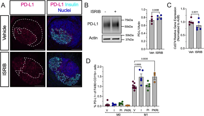 Fig. 8 ISR inhibition increases PD-L1 protein levels in prediabetic female NOD mice. Prediabetic 6-week-old female NOD mice were treated with ISRIB (2.5 mg/kg) for two weeks. A Representative images of pancreata from vehicle- or ISRIB-treated NOD mice stained for PD-L1 (magenta), insulin (cyan), and nuclei (blue). Dotted lines indicate insulitic regions. Scale bars: 100 μm. B Representative immunoblot showing PD-L1 and actin in M1-polarized BMDMs treated with vehicle or ISRIB (left panels) and quantification of PD-L1 levels (right panel); n = 4 biological replicates. C Relative Cd274 mRNA levels measured by qRT-PCR normalized to Actb in M1-polarized BMDMs in the presence or absence of ISRIB; n = 5 biological replicates. D Flow cytometry analysis of PD-L1 + cells as a percentage of F4/80 + CD11b + BMDMs under M0 and M1 polarization conditions; n = 4–5 biological replicates. Statistical tests: Paired t-test: B and C, or 1-way ANOVA with Tukey post-hoc test: D. Data are represented as mean ± SEM