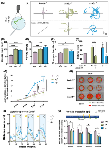 Fig. 3 Loss of kcnb1 leads to an altered behavioral phenotype, and light- and sound-induced locomotor impairments. (A) Schematic representation of the touch-evoked escape response (TEER) test. The tail of a 48 hours post-fertilization (hpf) embryo is mechanically stimulated, and the swimming trajectory of zebrafish is recorded. (B) Top part: Representative traces of individual swimming episodes at 48 hpf showing the typical tortuous trajectory of kcnb1 knockout models (kcnb1+/− and kcnb1−/−) as compared to the straight-line trajectory of kcnb1+/+ zebrafish (5 trajectories/genotype). Bottom part: One-cell stage eggs from kcnb1+/− and kcnb1−/− zebrafish were microinjected with the hKv2.1 wild-type (WT) plasmid, and the trajectory of embryos was analyzed at 48 hpf using the TEER test. The expression of the hKv2.1-WT construct allowed the rescue of the locomotor phenotype of kcnb1 knockout models by reproducing a more linear trajectory similar to WT embryos. (C–E) The quantification of the swimming trajectory tortuosity shows a significant increase of different parameters studied in both kcnb1 knockout conditions as compared to kcnb1+/+ embryos, including an increase in (C) the distance swam, (D) the velocity, and (E) the time spent in motion. Furthermore, within the same genotype, a huge variability in the swimming behavior has been observed, and zebrafish were divided into two distinct phenotypes: severe (at least two swim circles) and mild (other trajectories). The subdivision of both phenotypes is represented in Table S2 and Figure S2C–F (N = 3; n = 50–88/genotype; one-way analysis of variance [ANOVA] with Bonferroni post hoc test). (F) Distance swam by embryos at 48 hpf following a rescue with the hKv2.1-WT DNA construct and following a TEER test. Results show a significant reduction of the distance traveled by kcnb1 knockout models due to the expression of the hKv2.1-WT DNA (N = 3; n = 10–37/condition; unpaired t-test). (G) Representation of the average distance traveled by larvae at different days of development (from 3 to 6 days post-fertilization [dpf]) following a 10-min light–dark protocol, each period repeated 3 times. At 3 and 4 dpf, kcnb1+/+ and kcnb1 knockout zebrafish (kcnb1+/− and kcnb1−/−) presented low locomotor activity that was significantly increased from 5 to 6 dpf. A significant gap was observed starting from 5 dpf with locomotor hyperactivity for the kcnb1−/− condition as compared to kcnb1+/+ and kcnb1+/− zebrafish, reflecting the result obtained in Figure 3I. Colored statistical markers represent the comparison of locomotor activity of zebrafish with the same genotype, using the reference value at 3 dpf. Black statistical markers indicate comparisons between the three genotypes at specific time points (N = 3; n = 35/genotype; one-way ANOVA with Bonferroni post hoc test). (H) Schematic representation of individual trajectory of three zebrafish larvae per genotype obtained with ViewPoint software (Zebrabox). Between 3 and 6 dpf, a protocol was applied to larvae with three repetitions of 10 min in the light followed by 10 min in the dark (green lines: slow movements, <8 mm/s; red lines: fast movements, >8 mm/s). (I) Average distance swam by zebrafish at 6 dpf during the whole light–dark protocol described previously. Locomotor hyperactivity was observed in kcnb1−/− larvae in the light and continued to be significantly increased during the dark phase as compared to kcnb1+/+ and kcnb1+/− zebrafish (N = 3; n = 35/genotype; one-way ANOVA with Bonferroni post hoc test). (J) Quantification of the distance swam during the 5 s following each audio stimuli applied (450 Hz, 80 dB, 1 s) to larvae at 6 dpf. Both knockout conditions (kcnb1+/− and kcnb1−/−) present a significant decrease of the locomotor activity in response to audio stimuli as compared to the kcnb1+/+ condition (N = 3; n = 48–64/genotype; one-way ANOVA with Bonferroni post hoc test). *p < .05, **p < .01, ***p < .001, ****p < .0001. ns, non-significant.