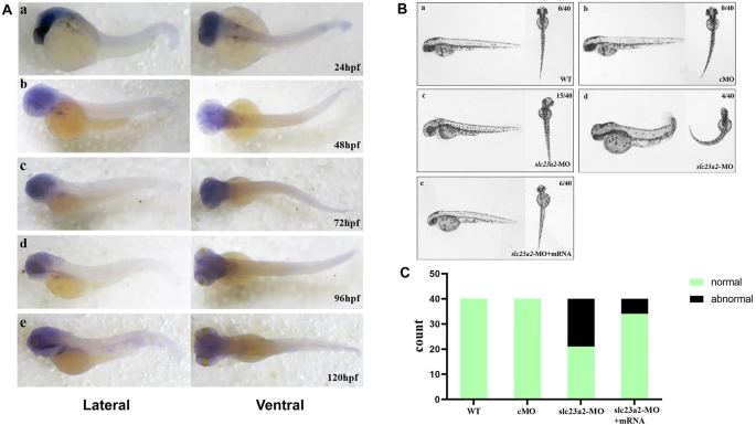 Fig. 2 Expression and functional analysis of slc23a2 in zebrafish. A In situ hybridization of slc23a2 in zebrafish from 24hpf to 120hpf. B Phenotype of 48hpf zebrafish embryo in WT, cMO, slc23a2-MO and slc23a2-MO+mRNA group. C Proportion of abnormal individuals in each group. Hpf, hours post fertilization. cMO, negative control zebrafish. slc23a2-MO, slc23a2 knock down zebrafish