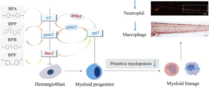 Fig. 6 Potential mechanisms of developmental immunotoxicity induced by BPA, BPB, BPF, and BPP. The upregulated genes are shown in red, and the downregulated genes are shown in blue.