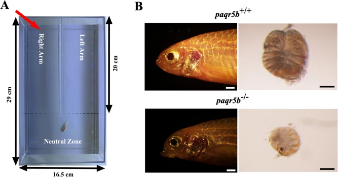 Fig. 1 Experimental device and fish. A Experimental device. The test tank dimensions were as follows: height, 11.8 cm; width, 16.5 cm; and length, 29 cm. The internal divider had a length of 20 cm. The three zones of the experimental tank, i.e., the left zone, right zone, and neutral zone, are indicated. The position where the compounds were applied is indicated in red. B Morphology of paqr5b fish. Representative image of the head region and dissected ORs of the wild-type (paqr5b+/+) and mutant (paqr5b−/−) zebrafish. Scale bars are 1 mm for the head region (white) and 200 µm for the OR (black)