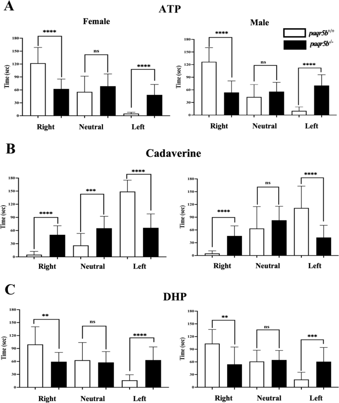 Fig. 2 Behavioral analysis results of paqr5b after compound addition. The total time spent in three separate areas (left, neutral and right zones) after the addition of ATP (A), cadaverine (B), or DHP (C) is indicated. The results for the wild-type (paqr5b+/+) and mutant (paqr5b−/−) zebrafish are represented by open or closed bars, respectively. For each compound, 15 trials involving 5 fish of each sex were conducted. Each value represents the mean of the data, and the vertical lines indicate the standard deviation. The significant differences in the time spent in each zone between the wild type and the mutant zebrafish are indicated (**P ≤ 0.001, ***P ≤ 0.0001, ****P ≤ 0.00001)