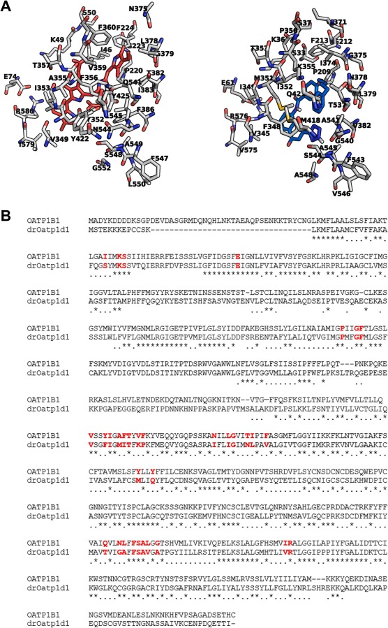 Fig. 7 Structural comparison of the binding pockets of human OATP1B1 and drOatp1d1. A The protein backbones are shown in white (nitrogens: blue; oxygens: red; sulfurs: yellow), with key binding site residues labeled; left: BIL (red); right: PRA (blue). B Sequence alignment between human OATP1B1 (UniProt entry Q9Y6L6) and drOatp1d1 (UniProt entry A0A8M9PU70). The residues in the binding pocket highlighted in red, indicating conserved key residues involved in ligand interaction and transport function. (For interpretation of the references to color in this figure legend, the reader is referred to the web version of this article.)