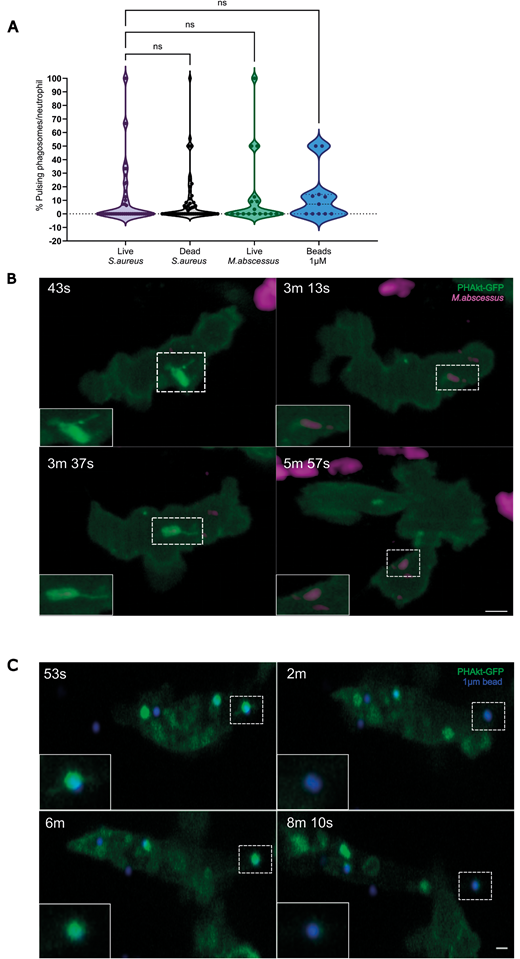 Fig. 3 Pulsatile bursts of PHAkt-eGFP recruitment are a neutrophil response to prey. (A) Violin plot showing the percentage of pulsing phagosomes per phagocytic neutrophil for live and dead S. aureus, live M. abscessus and 1 µm beads. Data shown are the median with the 25th and 75th percentiles. Live S. aureus, 46 phagosomes analysed from 11 independent larvae, from 11 experiments; dead S. aureus, 54 phagosomes, ten independent larvae, from ten experiments; live M. abscessus, 18 phagosomes, six independent larvae, six experiments; 1 µm beads, 11 phagosomes, four independent larvae, four experiments. ns, not significant (Kruskal–Wallis test). (B) ‘Pulses’ occur on phagosomes containing M. abscessus. PHAkt-eGFP recruits to phagosomes during phagocytosis (43 s) before gradually diminishing (3 min 13 s). PHAkt-eGFP then re-recruits to the phagosome (1st pulse; 3 min 37 s) and then diminishes again (5 min 57 s). Scale bar: 2 µm. (C) Pulses occur on phagosomes containing 1 µm beads. PHAkt-eGFP recruits to phagosomes during phagocytosis (53 s) before gradually diminishing (2 min). PHAkt-eGFP then re-recruits to the phagosome (1st pulse; 6 min) and then diminishes again (8 min 10 s). Phagocytosis starts at 0 min. Scale bar: 1 µm.