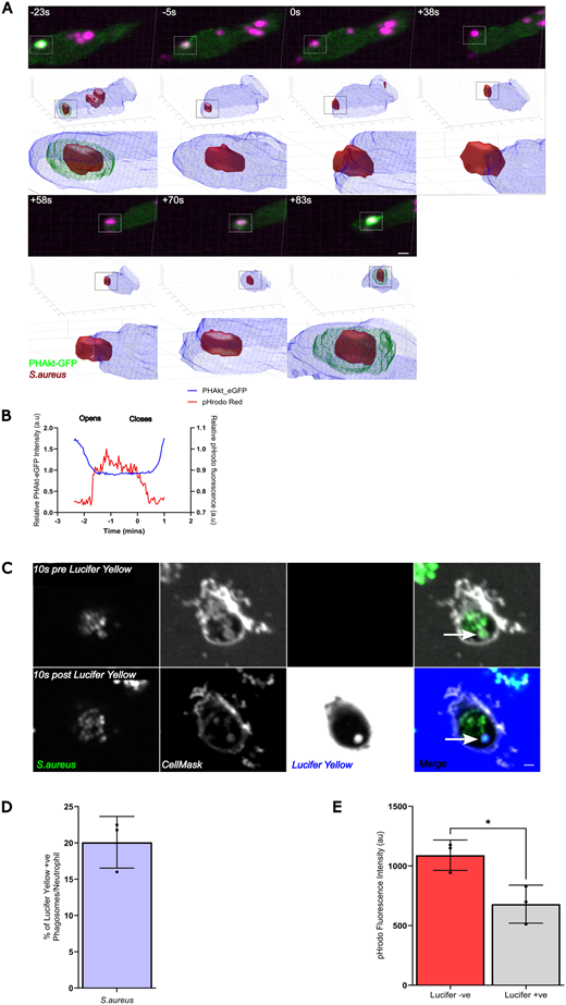 Fig. 5 A subset of neutrophil phagosomes may remain unsealed. (A) Sequential images and 3D reconstruction of PHAkt-eGFP dynamics when S. aureus is within a phagosome (−23 s), the phagosome re-opens (0 s) and then re-closes (+70 s). Scale bar: 2 µm. (B) Quantification of the change in PHAkt-eGFP fluorescence of pHrodo-stained S. aureus when a neutrophil phagosome re-opens and closes. (C) Images illustrating the accumulation of Lucifer Yellow in a formed human neutrophil phagosome (arrows). There was a 20 s delay between imaging, adding Lucifer Yellow and then re-commencing imaging as we needed to unload the plate from the microscope to add the dye. Scale bar: 1 µm. (D) Quantification of the percentage of Lucifer Yellow+ phagosomes in human neutrophils at 30 months post infection (mpi). Data shown are the mean±s.d. of 2779 phagosomes analysed from three experiments. (E) Quantification of pHrodo fluorescence in Lucifer Yellow− versus Lucifer Yellow+ phagosomes at 60 mpi. Data shown are the mean±s.d. of 4369 phagosomes analysed from three experiments. *P<0.05 (unpaired t-test).