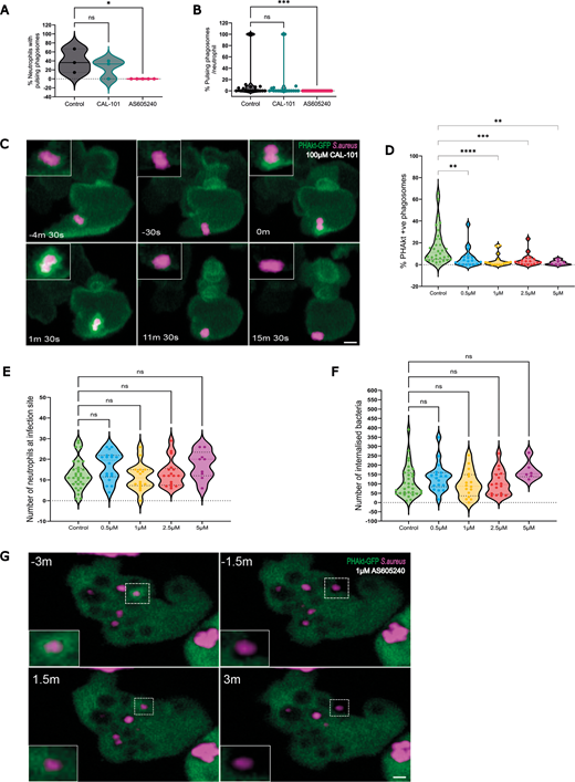 Fig. 6 Pulses of PHAkt occur despite inhibition with CAL-101 and are abolished by AS605240. (A) Violin plot showing the percentage of neutrophils that have pulsing phagosomes. Timelapse started 2 h post infection following 30 min incubation of Tg(lyz:PHAkt-EGFP)i277 larvae with 100 µm CAL-101 and 1 µm AS605240. Data shown are the median with the 25th and 75th percentiles from 87 neutrophils, 11 independent larvae, 11 experiments. (B) Violin plot showing the percentage of pulsing phagosomes in each neutrophil in a timelapse starting 2 h post infection following 30 min incubation of Tg(lyz:PHAkt-eGFP)i277 larvae with 100 µm CAL-101 and 1 µm AS605240. Data shown are the median with the 25th and 75th percentiles from 780 phagosomes, 11 independent larvae, 11 experiments. (C) Sequential images illustrating pulsatile recruitment of PHAkt-eGFP to a phagosome exposed to 100 µm CAL-101. Scale bar: 2 µm. (D) Violin plot showing quantification of the percentage of PHAkt-eGFP+ phagosomes 2 h post infection following 30 min incubation with AS605240. Data shown are the median with the 25th and 75th percentiles from six independent larvae, from six experiments. (E) Violin plot showing quantification of the number of neutrophils at a S. aureus infection site 2 h post infection following 30 min incubation with AS605240. Data shown are the median with the 25th and 75th percentiles from six independent larvae, six experiments. (F) Violin plot showing quantification of the number of bacteria/neutrophils 2 h post infection following 30 min incubation with AS605240. Data shown are the median with the 25th and 75th percentiles from six independent larvae, six experiments. (G) Sequential images illustrating that PHAkt-eGFP recruits to neutrophil phagosomes prior to exposure to 1 µm AS605240 (3 min before attempted re-phagocytosis (−3 min). Bacteria are then released from the phagosome (−1.5 min). Following exposure to 1 µm AS605240, the neutrophil attempts to re-phagocytose the bacteria, but PHAkt-eGFP does not recruit to the phagosome (1.5 min), and the bacteria are released from the phagosome (3 min). Scale bar: 2 µm. *P<0.05, **P<0.005, ***P<0.001, ****P<0.0001 (Kruskal–Wallis with multiple comparisons).