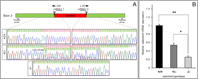 Fig. 1 Molecular characterization of the adamtsl4-KO zebrafish line generated using CRISPR/Cas9 genome editing. A. Localization of the deletion identified in adamtsl4 exon 3. Scissors: DNA cleavage sites targeted by two crRNAs (crRNA1.1 and crRNA1.2). The numbers indicate the cDNA nucleotide positions corresponding to the start and end of the deleted DNA fragment. Wild-type sequences are highlighted with a green background, while deleted sequences are marked with a red background. Arrows: position of the forward and reverse primers used for zebrafish genotyping. Rectangles in the electropherograms mark the 5′ and 3′ ends of the deletion. B. Reduced mRNA levels in adamtsl4-KO zebrafish larvae. Relative adamtsl4 mRNA levels were measured in 6 days post-fertilization (dpf) zebrafish larvae using RT-qPCR. Data represent the mean ± standard error, derived from three independent experiments performed in triplicate, using pools of 50 larvae. Statistically significant differences between KO and wild-type zebrafish are denoted by asterisks: p < 0.05 (∗), p < 0.01 (∗∗). (For interpretation of the references to colour in this figure legend, the reader is referred to the Web version of this article.)