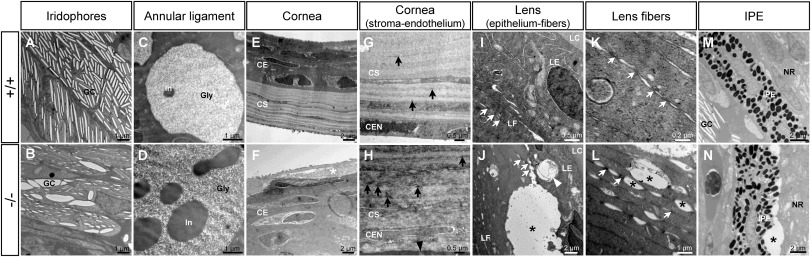 Fig. 8 Transmission electron microscopy of the ocular anterior segment structures in adult (3-months-old) F3 adamtsl4 KO zebrafish. Tissue sections were prepared as described in the Materials and Methods section. Representative images of wild type (+/+) and KO (−/−) zebrafish are shown. A-B. Guanine crystals (GC) in iridophores. C-D. Glycoprotein aggregates (Gly) and cytoplasmic inclusions (In) in annular ligament cells. E-F. Cornea showing the thickened corneal epithelium (CE) and the necrotic superficial epithelial cell (white asterisk) in the KO zebrafish. G-H. Corneal stroma (CS) and endothelium (CEN). Note the contact between the CEN with the abnormal annular ligament in the KO zebrafish (black arrowhead). I-J. Lens epithelium (LE)-fiber (LF) interphase. K-L. Lens fibers. Gap junctions (white arrows). M-N. Iris pigment epithelium (IPE)-neuroretina (NE) interphase. Black asterisks: abnormal intercellular separations.