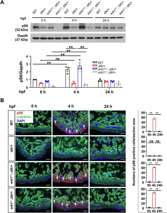 Fig. 5 Deregulated nutrient response is a pathological event in dA/+ that can be rescued by erk1 inhibition. (A) Representative western blots of protein pS6 and Gapdh from 3 months old zebrafish hearts at 0/4/24 h post feeding and quantification of pS6. One-way ANOVA was used to compare multiple groups. Data are presented as mean ± SEM, three biological replicates, **p < 0.01, WT, wild type, ns, non-significant. (B) Representative images and quantification of pS6 in cryosectioned heart tissues of WT, dA/+, erk1+/−; dA/+ and erk1−/−; dA/+ zebrafish mutants at 0/4/24 h post feeding, co-immunostained using anti-pS6 antibody and anti-α-actinin antibody. α-actinin, green. pS6, red. DAPI, blue. The open arrowheads indicate pS6 signal. pS6 indicates phosphorylated S6 ribosomal protein. Scale bars: 20 μm. One-way ANOVA was used to compare multiple groups. Data are presented as mean ± SEM, three biological replicates, **p < 0.01, WT, wild type, ns, non-significant. (For interpretation of the references to colour in this figure legend, the reader is referred to the web version of this article.)