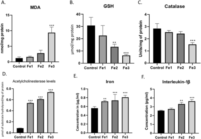 Fig. 4 Ferrous Sulphate (1.5, 3, and 6 mg/L) disrupted the antioxidant mechanism in zebrafish and increased the levels of Acetylcholine esterase, Iron and Interleukin-1β in the zebrafish brain. (A-C) Graphical representation of the enzymes specific activity to estimate the oxidative stress in the zebrafish brain. (D) Graphical representation of the levels of Acetylcholinesterase in the zebrafish brain. (E) Graphical representation of the levels of tissue bounded iron levels in the brain of the zebrafish. (F) Graphical representation of the levels of Interleukin-1β in the zebrafish brain. Data are represented as means ± S.E.M. (n = 10). For Bonferroni’s post hoc analyses: (A) Control vs. Fe3(6 mg/L): *** p < 0.0001. (B) Control vs. Fe2(3 mg/L): ** p < 0.001, Control vs. Fe3(6 mg/L): *** p < 0.0001. (C) Control vs. Fe3(6 mg/L): *** p < 0.0001. (D) Control vs. Fe1(1 mg/L): *** p < 0.0001, Control vs. Fe2(3 mg/L): *** p < 0.0001, Control vs. Fe3(6 mg/L): *** p < 0.0001. (E) Control vs. Fe1(1.5 mg/L): ** p < 0.001, Control vs. Fe2(3 mg/L): *** p < 0.0001, Control vs. Fe3(6 mg/L): *** p < 0.0001. (F) Control vs. Fe2(3 mg/L): ** p < 0.001, Control vs. Fe3(6 mg/L): *** p < 0.0001
