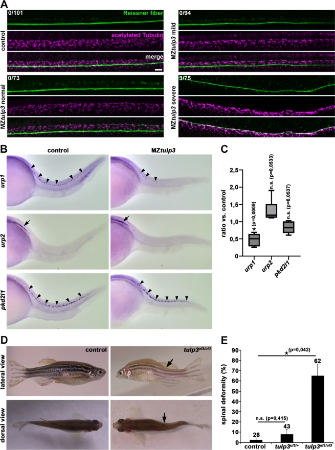 Fig. 3 Tulp3 knockout results in decrease of urp1 expression and scoliosis during zebrafish development. (A) Representative confocal images of MZtulp3 embryos (without curvature phenotype (normal), mild and severe ventral body curvature) and respective control embryos at 2dpf immunostained with anti-RF and anti-acetylated Tubulin as a ciliary marker. Loss of Tulp3 results in no obvious defects in RF formation compared to the control. Numbers represent embryos displaying RF disorganization and embryos that have been analysed in total from 3 independent experiments (control: n = 33, n = 42 and n = 26; MZtulp3 (normal): n = 11, n = 38 and n = 24; MZtulp3 (mild): n = 30, n = 28 and n = 36; MZtulp3 (severe): n = 22, n = 28 and n = 25). Scale bar: 10 μm. (B) WISH analysis reveals reduced urp1 expression in ventral CSF-cNs (black arrowheads) of MZtulp3 embryos (presenting with a ventral curvature phenotype) compared to the control at 28hpf. Expression levels of urp2 (black arrow) and pkd2l1 (black arrowheads; serves as a control as its expression in CSF-cNs has been shown to be unaffected in ciliary mutants42,47) are comparable between MZtulp3 and control embryos at 28hpf. (C) qPCR analysis reveals unaltered expression of urp2 and pkd2l1 while urp1 expression was significantly reduced in MZtulp3 embryos compared to the respective control at 2dpf. (D, E) Representative images (lateral and dorsal views) and quantification of adult (18 months) tulp3 mutant zebrafish displaying scoliosis phenotypes (black arrows) in comparison to the respective control analysed from 3 independent breedings (control: n = 15, n = 13 and n = 0; heterozygous tulp3 mutant: n = 29, n = 6 and n = 8; homozygous tulp3: n = 15, n = 40 and n = 7); total number of adult fish used for analyses are shown above respective bar.