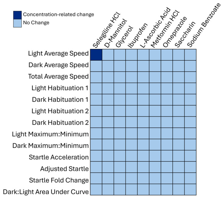 Behavioral neurotoxicity results from a 13-endpoint analysis presented in a heatmap identifying only one endpoint (light average speed for selegiline hydrochloride) that revealed a concentration-related change based on the concentration–response modeling analysis, shaded dark blue. The endpoints that did not show any changes are shaded light blue. The 13 endpoints are listed on the vertical axis and chemicals on the horizontal axis.