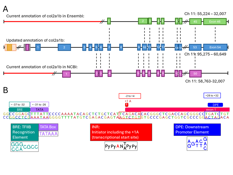 Fig. 1 Elucidation of missing exons and transcriptional start site for zebrafish col2a1b: A. Schematic of comparisons of the Ensembl (top) and NCBI (bottom) genomic sequence of the col2a1b gene compared to our updated sequence annotation (middle). The green, blue, and pink squares represent the exons for Ensembl's annotation, current annotation, and NCBI's annotation respectively. Diagram shows that for both the Ensembl and the NCBI annotations, they are missing exons 1, 2, 3, 4, and 8 in both. Ensembl is also missing exons 5, 6, and 9. NCBI is missing the last exon, updated exon 54, that Ensembl does have labeled as the 46th exon. Ensembl has 46 exons for col2a1b in total spanning from 55,224 to 32,007 on the reverse strand of chromosome 11 of the current reference genome: GRCz11 (GCA_000002035.4). NCBI has a total of 50 exons for their annotation spanning from 58,763 to 32,007 on the reverse strand of chromosome 11 of the current reference genome: GRCz11 (GCA_000002035.4) Current annotation of col2a1b has 54 exons and spans from 95,275 to 60,649 on Danio rerio strain Tubingen chromosome 11 genome assembly from NHGRI (GenBank: CP137024.3). Orange and yellow square and grey and pink square represent identified regulatory elements and transcriptional promoter elements of col2a1b. Red lines in schematic for NCBI and Ensembl represent the start of poor sequencing quality upstream of the identified first exon. B. Schematic of the basal promoter elements for col2a1b. BRE (TFIIB Recognition Element), INR (Initiator Element), and DPE (Downstream Promoter Element) were identified.