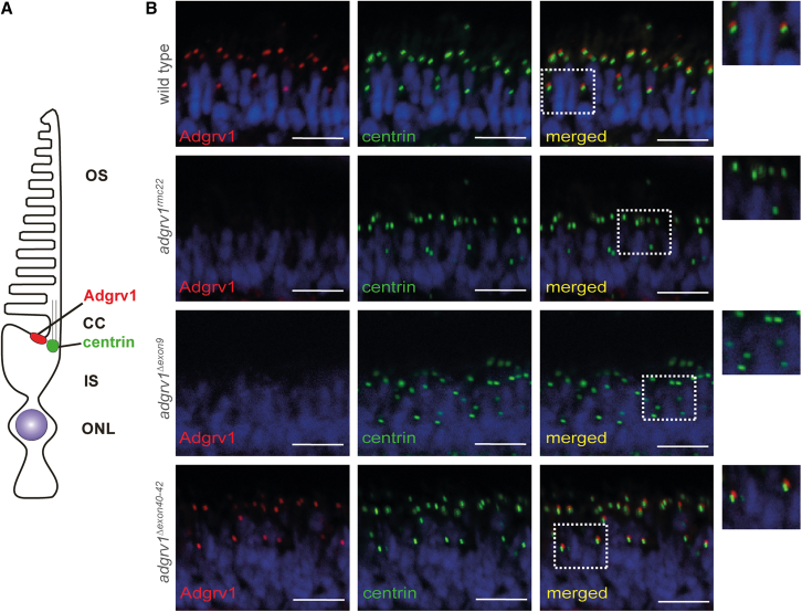 (A) Schematic representation of a zebrafish photoreceptor cell. OS, outer segment; CC, connecting cilium; IS, inner segment; ONL, outer nuclear layer. (B) Retinal cryosections of wild-type, homozygous