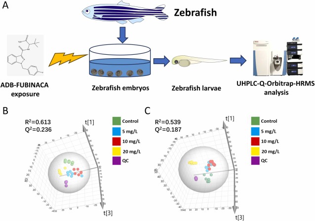 Fig. 4 ADB-FUBINACA exposure causes metabolic disorders in zebrafish. (A) Flow chart of the ADB-FUBINACA exposure experiment. (B) 3D PCA score plot in negative mode. (C) 3D PCA score plot in positive mode. In the PCA model. In the 3D PCA model, different colors were used to represent the different groups: green for the control group, blue for the 5 mg/L of ADB-treated group, red for the 10 mg/L of ADB-treated group, yellow for the 20 mg/L of ADB-treated, and purple for the QC group.