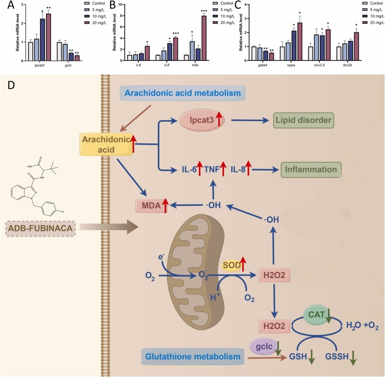 Fig. 7 ADB-FUBINACA induced changes in the transcription levels of related genes. (A) Expression of metabolism-related genes (lpcat3 and gclc). (B) Expression of inflammation-related genes (il-6, il-8, and tnfa). (C) Expression of cardiac development-related genes (nkx2.5, nppa, gata4, and tbx2b). (D) Schematic of developmental toxicity in zebrafish embryos after ADB-FUBINACA exposure. This schematic was drawn by Figdraw (https://www.figdraw.com/). (ID: RYTIYcb092). The data were presented as mean ± S.D. of three independent experiments (n = 30). * p < 0.05, ** p < 0.01, *** p < 0.001.