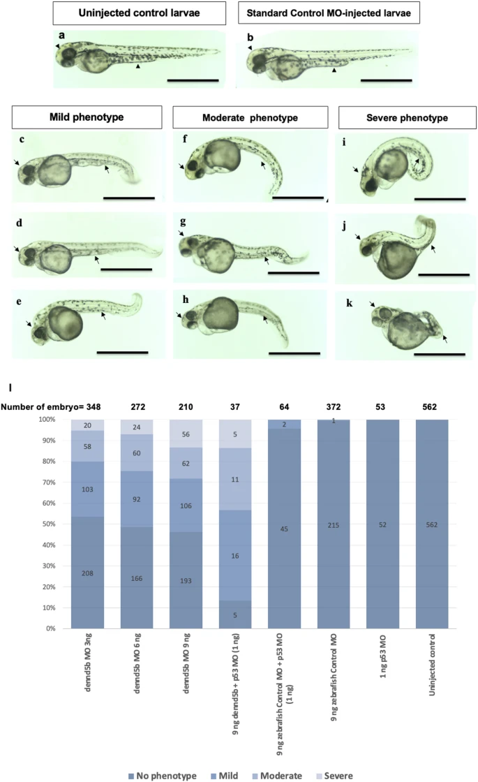 Fig. 3 MO knockdown of dennd5b indicates its critical role in embryo development. a An uninjected zebrafish embryo at 48 hpf exhibits no observable phenotype. b Zebrafish embryos injected with the standard control morpholino show no signs of physical deformity at 48 hpf. c–e A mild phenotype, f–h a moderate phenotype, and i–k a severe phenotype was observed following dennd5b MO knockdown, underscoring the critical role of dennd5b in early zebrafish embryonic development. The scale bar indicates 890 μm. l A graphical representation illustrates the effects of three different dosages of dennd5b MO injection, demonstrating a dose-dependent increase in phenotypic severity, including a compressed head and deformed tail, as compared to embryos injected with the standard control MO