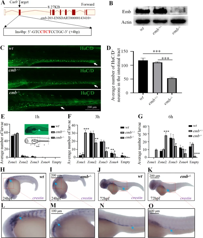 Fig. 1 Loss of emb causes ENS defects in zebrafish. A, Generation of targeted emb mutant in Zebrafish. A 4 bp insertion in Exon 2 was introduced through the CRISPR/Cas9 system. B, Expression of the Emb protein is disrupted in different genotypes determined by western blots. C, The enteric neurons at 5 dpf zebrafish larva of wild type (wt), heterozygous and homozygous emb mutants are labeled by HuC/D and white arrows point to the most posterior margin where the enteric neurons migrated to. D, Quantification of the numbers of HuC/D positive cells in the intestinal tract, ***, p < 0.001, one-way ANOVA with Bonferroni post-hoc, N = 10 for each group. E-G, Quantification of the number of larvae in each group based on the anterior extent of tracer. “empty” means fluorescent tracers are completely evacuated in the intestine. Statistical significances compared to wt are labeled on top of each bar, *, p < 0.05; **, p < 0.01; ***, p < 0.001, one-way ANOVA with Bonferroni post-hoc, N = 60. H-K, Lateral view of in situ hybridization results of 24 hpf and 72 hpf larvae using crestin probe, blue arrows point to migrating neural crest cells. L-O, Locally enlarged images of the H–K images (Red dashed box)