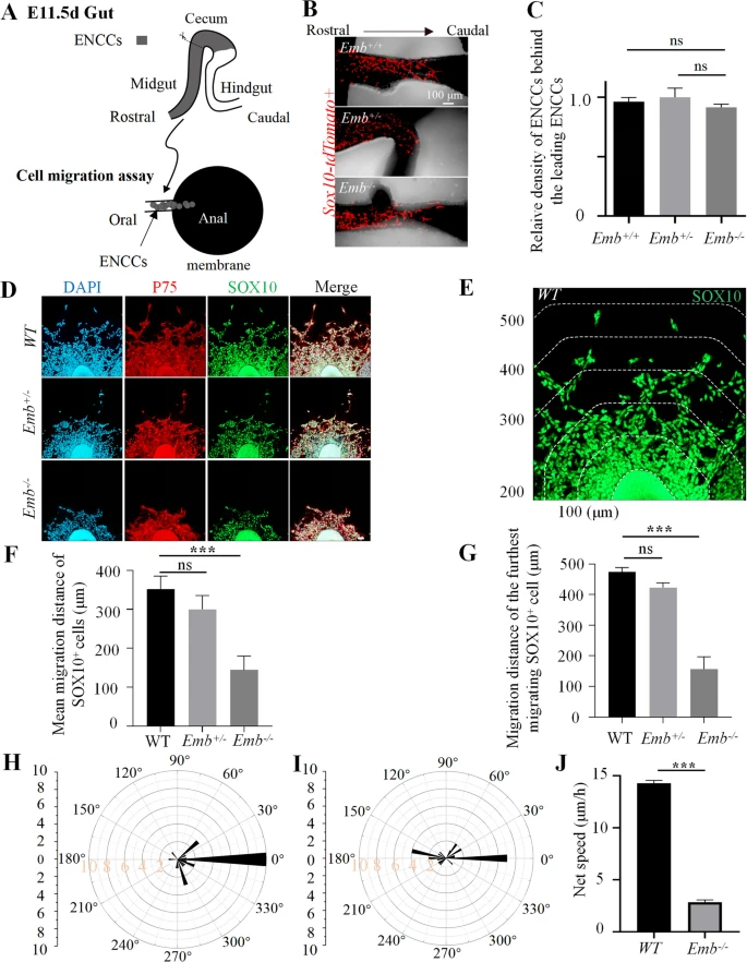 Fig. 4 Emb is required for the migration of the ENCCs in gut explant. A, Schematic illustrating the ENCC migration assay in mouse gut explants. B Using the transgenic mice with ENCCs labeled by genetically encoded tdTomato, and the ENCCs were marked by Sox10 (red) in E12.5d mice. C, Relative density of ENCCs behind the leading ENCCs, NS, non-significance, one-way ANOVA with Bonferroni post-hoc, N = 4. D, Representative images of the in vitro ENCC migration assay, ENCCs are labeled with P75NTR (red) and Sox10 (green). E, Quantification methods of the in vitro migration assay, the membranes were divided into five regions based on the distance from the margin of the explant and the numbers of Sox10 positive cells in each region were counted and quantified. F and G, Mean migration distance of Sox10+ cells and migration distance of the furthest migrating Sox10+ cell in different groups; **, p < 0.01; ***, p < 0.001, one-way ANOVA with Bonferroni post-hoc, N = 3. H and I, Polar histograms representing the trajectories of the cells which were 150 μm from the most caudal cell at 40-min intervals in WT (H) and Emb-/- explants of E12.5d hindgut (I). The trajectories are determined by drawing a straight line from the position of cell to its position 40 min previously, with the 0 degree as the rostrocaudal axis of the gut (27 cells were examined). J, Quantification of the average net speed by measuring the distance between the location of the wave front at the beginning of the time lapse sequence and its location at the end of the sequence. ***, p < 0.001, two-tailed Student’s T test, N = 3