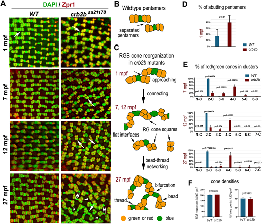 Fig. 3 Crb2b deficiency gradually changes the isolated linear mirror-symmetric pentameric configuration of RGB cones into a bead–thread network. (A) Transverse imaging of RGB cones in the wild-type and crb2bsa21178 homozygous mutants of different ages. RGB cone nuclei were stained with DAPI (green), and green and red cones were stained with Zpr1 (red). Large white arrows indicate the groups of RGB cones depicted in panels B and C. Small double arrows indicate blue cones associated with only one cone square; arrowheads indicate square ends with no blue cones attached. (B) The diagram depicts the pentamers in the wild-type retina. (C) Diagrams depict the gradual alteration of the pentameric configuration into a bead–thread network pattern over time in crb2bsa21178 mutants. Orange indicates red or green cones, and green indicates blue cones. The bead–thread networks of RGB cones become apparent even at 7 mpf. Images were taken from the dorsal intermediate regions of the retina. (D) The percentages of abutting pentamers were higher in crb2bsa21178 mutants than those in wild-type retina at 1 mpf (n = 4 fish). (E) The percentages of green and red cones in clusters of various sizes. 1-C indicates isolated single cells; 2-C, two-cell clusters; etc. The percentages were compared between the wild-type and mutants at 7 mpf, 12 mpf, and 27 mpf (n = 4 fish). (F) The densities of RGB and UV cones in the wild-type and crb2bsa21178 homozygous mutants at 27 mpf (n = 4 fish; one tangential confocal image per fish). The P values were calculated by Student's t-test.