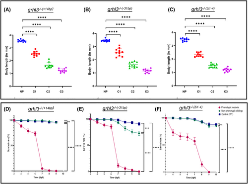 Fig. 3 Maximum body length and survival age quantitation of grhl3−/− embryos. (A–C) Quantitation of body length of class 1, class 2, and class 3 grhl3−/−(+14 bp), grhl3−/−(−31bp), and grhl3−/−(Δ1-4) embryos. Data are represented as mean ± SEM; n = 10. (D–F) Maximum survival age of grhl3−/−(+14bp), grhl3−/−(−31 bp), and grhl3−/−(Δ1-4) embryos. ***p <.005; ****p <.001; ns, non-significant. Statistical significance determined by Student's t-tests.