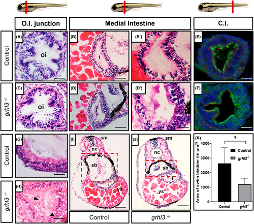 Fig. 7 Intestinal epithelial and swim bladder morphology in grhl3−/−(−31) mutants. (A–D) Transverse-sections of 5 dpf intestine of control (A, B, B') and class 1 grhl3−/−(−31) (C, D, D') embryos highlighting the morphology of the intestinal region. (E, F) E-cadherin (green) and rhodamine phalloidin (red) expression in the intestinal lumen of control (E) and grhl3−/−(−31) (F) 5 dpf embryos. (G, H) Transverse-sections of 7 dpf intestine of control (G) and class 1 grhl3−/− mutants (H); black arrows show extensive red blood cell infiltration into the intestinal lumen. (I, J) Swim bladder morphology and size in grhl3−/− mutants and non-phenotypic siblings. (K) Area of swim bladder in grhl3−/− embryos and non-phenotypic siblings. Data represented as mean ± SEM; n = 3. Statistical significance determined by Student's t-test *p <.05. Scale bars: 20 μm (A, C, B', D', G, H), 50 μm (B, D, E, F) and 100 μm (I, J). Esophageal-Intestinal Junction [oi]; Caudal Intestine [C.I.]; Swim bladder [sb]; intestine[i]; yolk sac [ys]; notochord [nc]; somatic muscle [sm].