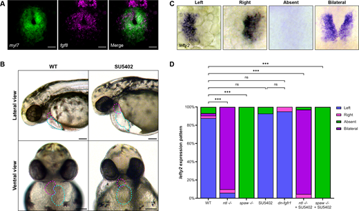 Fig. 1 FGF signaling is active in the developing heart and necessary for proper heart development. (A) RNA ISH by hybridization chain reaction for fgf8 (magenta) and myl7 (green) in the cardiac cone of a 20 hpf WT embryo. Scale bars: 25 µm. (B) Representative images of 48 hpf WT embryos or embryos treated with the FGF inhibitor SU5402 from 19 to 30 hpf. Magenta dashed lines outline the ventricle, cyan dashed lines the atrium. SU5402-treated embryos display aberrant cardiac looping, misshapen and misplaced chambers, and pericardial edema. (C) ISH for the Nodal target gene lefty2 (lft2) in the cardiac cone of 20 hpf embryos shows correct left-sided lefty2 and incorrect right, bilateral or absent lefty2 expression. (D) Quantification of lefty2 expression sidedness. WT, n=74; ntl−/−, n=50; spaw−/−, n=36; SU5402, n=41; dn-fgfr1, n=20; ntl−/−+SU5402, n=177; spaw−/−+SU5402, n=63. ***P<0.0001 (Chi-square analysis). ns, not significant. (A,C) Images are dorsal views, with anterior to the top and left to the reader's left.