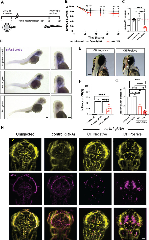 Fig. 1 col4a1 crispant zebrafish larvae exhibit spontaneous brain haemorrhages A. Schematic representation of the col4a1 crispant experimental timeline. Crispants were injected as single cell zygotes with a cocktail of four gRNAs targeting the zebrafish col4a1 gene. B. The survival of zebrafish larvae as the mean percentage alive at various time points for col4a1 crispants injected with col4a1 gRNAs (red), compared to siblings injected with a control gRNA (grey) or left uninjected (black). Measurements commenced at 6 hpf after fertilisation was confirmed. The mean percentage was calculated from four experimental repeats. C. col4a1 gene expression analysis of col4a1 crispant larvae compared to control-injected and uninjected larvae was conducted using RNA extracted from whole larvae at 3 dpf. Relative mRNA expression was quantified using pooled whole larvae (n = 24 per sample). Individual points represent each result for each biological replicate (n = 5). D. Whole-mount in situ hybridisation of fixed bleached zebrafish larvae at 3 dpf with an antisense probe (purplish-blue signal) for col4a1 mRNA throughout the entire body (left) and in the heads (right). Scale bar = 200 µm. E. Lateral view of an ICH- control zebrafish and an ICH+ (white arrows) col4a1 crispant at 3 dpf. Images were acquired with a 6.3x objective, and the scale bar represents 100 µm. F. ICH was identified using brightfield microscopy and mean incidence of spontaneous ICH at 3 dpf from 7 biological repeats are shown as individual data points. G. col4a1 expression in whole zebrafish larvae at 3 dpf injected with either col4a1 targeting or control gRNAs and cas9 relative to uninjected controls. Before RNA extraction, col4a1 crispants were split into ICH+ or the ICH- group n = 23 larvae per group, per biological replicate, with each repeat shown as an individual point. H. Maximum intensity projection images of col4a1 crispants captured using light-sheet microscopy with a 20x objective and 1x digital zoom. Transgenic zebrafish larvae with fluorescent vasculature using false colours transgenic blood Tg(gata1:dsred) shown as magenta and endothelial cell-specific Tg(fli1:EGFP) shown as yellow in a dorsal orientation at 3 dpf. Controls were uninjected or injected with a control gRNA. Scale bar = 100 µm. B-C & F-G. Data were analysed using one-way ANOVA with mean displayed and error bars indicate the standard deviation of the mean. Asterisks denote means that are significantly different at the 5 % level, as determined by the Tukey HSD test: ns P > 0.05, **P ≤ 0.01, *** P ≤ 0.001 and **** P ≤ 0.0001. C&G. Gene expression was assessed by qRT-PCR and calculated using the comparative ΔΔCt method, normalising expression to both actin and gapdh housekeeper genes with expression shown relative to uninjected mRNA expression.