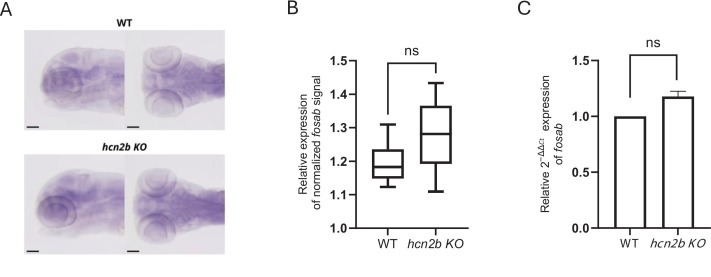 Fig. 2 Analysis of fosab expression. A. Whole-mount in situ hybridization of fosab in WT and hcn2b KO larvae shows uniform expression throughout the brain. No region-specific differences were observed. Scale bar: 100 μm. B. Quantification of normalized signal intensity of WISH (n = 7 larvae per group) revealed no significant difference between WT and hcn2b KO (unpaired t-test, p > 0.05). C. RT-qPCR analysis of fosab expression using the ΔΔCt method (n = 4 biological replicates per group) showed a non-significant trend toward increased expression in hcn2b KO mutants compared to WT (unpaired t-test, p > 0.05).