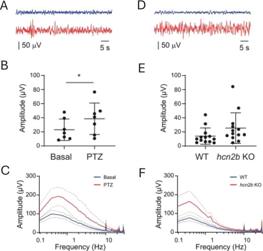 Fig. 3 Electrophysiological activity from extracellular recordings. A and D. Representative traces showing electrical activity components from 0.5 to 8 Hz, control or basal activity is shown in blue and PTZ and hcn2b mutants activity is shown in red. B. Average amplitude taken from 2 to 4 Hz spectra indicates the mean, standard deviation and individual subjects, shows a significant increase in PTZ (*p < 0.05, Wilcoxon's t-test, n = 7). C. Summary amplitude distribution along the frequency spectra in basal (blue) and PTZ (red), thin lines show the S.E.M. E. Average amplitude taken from 2 to 4 Hz spectra indicates the mean, standard deviation and individual subjects show a trend to increase in the amplitude without a significant change on hcn2b KO compared to the control group. F. Summary amplitude distribution along the frequency spectra in control group (blue) and hcn2b KO (red), thin lines show the S.E.M.