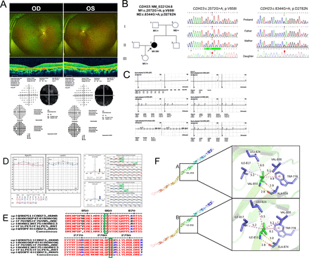 Fig. 1 Mutation sequence analysis and clinical examination of the family. (A) Fundus photographs, OCT scans and perimetry results of both eyes of the patient. (B) Pedigree of the family: The filled black symbol represents the affected member, and the arrow denotes the proband. (C) ERG: Significant impairment of cone and rod cell function in both eyes. (D) Pure tone audiometry results of the patient. (E) The homology of amino acid sequences between human CDH23 and other species; the amino acid at positions 858 and 2783 are highly conserved among species, and the mutated residues 858 and 2783 are boxed and indicated. (F) The change in the interaction distance between wild type and mutant proteins further indicates spatial changes. ERG, electroretinography; OCT, optical coherence tomography.