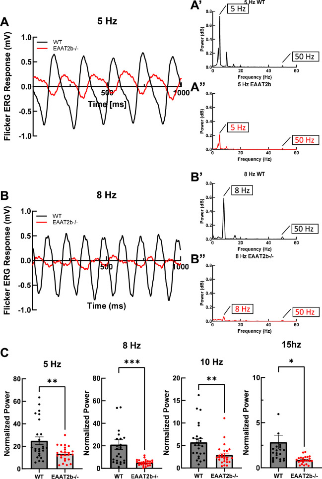 Temporal resolution of flicker ERG responses is reduced in eaat2b mutant fish. (A) Representative flicker ERG responses to a 5 Hz stimulus in WT controls (black) and eaat2b−/− larvae (red). Corresponding FFT power plots for WT (A′) and eaat2b−/− (A″) were generated in MATLAB from the traces shown in (A). (B) Representative flicker ERG responses to an 8 Hz stimulus in WT controls (black) and eaat2b−/− larvae (red). Corresponding FFT power plots for WT (B′) and eaat2b−/− (B″) were generated from the traces shown in (B). (C) Normalized power of flicker ERG responses at specified frequencies in WT controls and eaat2b−/− larvae. Power values were normalized to the 50 Hz line-noise peak. Statistical significance: p = 0.0039 at 5 Hz, p = 0.0007 at 8 Hz, p = 0.0031 at 10 Hz, p = 0.0133 at 15 Hz. Statistical analysis was performed using t-tests and nonparametric tests in GraphPad Prism, v. 8. Data are presented as mean ± s.e.m. Significance levels are indicated as follows: *p < 0.05; **p < 0.01; ***p < 0.001.