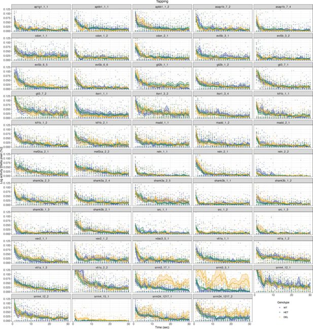 Fig. 4 - Supplemental 2 Activity response and habituation to tapping stimuli. Log-scaled activity (percentage of Δpixels/s) at each of the 30 consecutive taps for each microexon and regulator deletion line and biological replicate (clutch). A+1 pseudocount was added to the activity data for plotting purposes only. Traces represent mean ± SEM across larvae from the same clutch and genotype. For simplicity, for the srrm3/4 double mutant, WT denotes srrm3+/+,srrm4-/-, Het srrm3+/-,srrm4-/-, and DEL srrm3-/-,srrm4-/-.