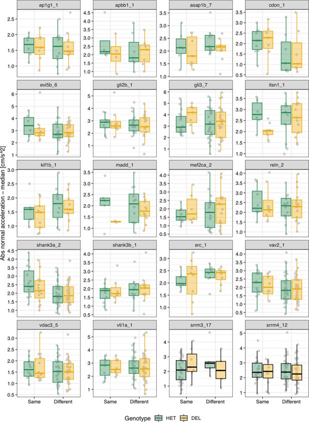 Fig. 5 - Supplemental 3 Median absolute normal acceleration by genotype for each main microexon and regulator line. (A) Median absolute normal acceleration (cm/s2) for each fish over the 10' time course by pair type. ‘Same’ corresponds to either Het-Het or Del-Del pairs, and each data point is the median of the pair, and ‘Different’ to Het-Del pairs and each data point corresponds to an individual fish. None of the comparisons between Het and Del individuals were significant at a threshold of p<0.01 using Wilcoxon Rank-Sum tests.