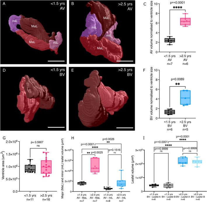 3D render views of adult zebrafish valves. (A–C) 3D render views (A, B) and quantification (C) showing the volume of the entire AV (leaflet volumes combined) in young (A, C) and aged (B, C) fish. (D–F) 3D render views (D, E) and quantification (F) showing the volume of the entire BV in young (D, F) and aged (E, F) fish. In both cases the valve volume is normalised to the ventricular area for each fish. (G) Quantification of ventricular area as measured from confocal imaging of cleared hearts. (H, I) Quantification of the combined volume of the major and minor leaflets of the AV (H) and individual leaflets of the BV (I) in young and aged fish. MaL, major leaflets; miL, minor leaflets. Statistical analysis: C, F, G = Welch's