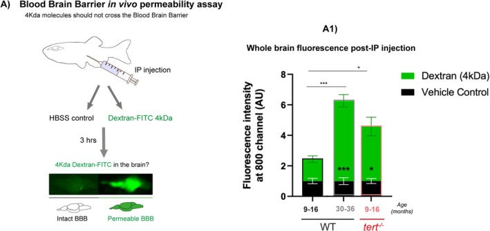 Telomerase depletion is associated with increased BBB permeability with ageing in the zebrafish brain. (A) Schematic figure of the BBB permeability assay. Dextran‐FITC 4 kDa or vehicle control (HBSS) were injected by intraperitoneal injection. 3 h later the brains were dissected and imaged in the Odyssey CLx (Li‐cor) to confirm the presence of Dextran‐FITC. Quantification of the green fluorescence in the fish brains shows higher FITC expression in old WT (> 30 months) compared to middle aged ones (9–16 months). This increased presence of dextran‐FITC in