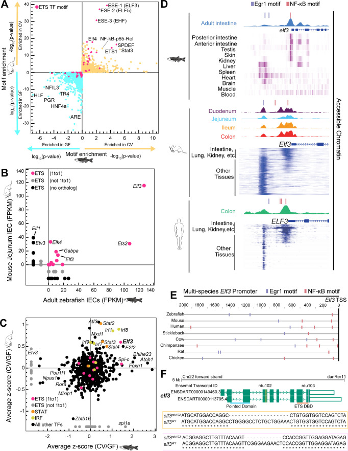Identification of a candidate TF mediating conserved host responses to the microbiota. (A) TFBM enrichment as assessed by default Hypergeometric Optimization of Motif EnRichment (HOMER) software (47) near genes microbially responsive in mouse (y-axis) and zebrafish (x-axis) digestive tissue. The log10(P-value) (GF/CV) and −log10(P-value) (CV/GF) are plotted for motif enrichment. Both comparisons are plotted on each axis for mouse (y-axis) and zebrafish (x-axis) and are differentiated by the blue and yellow arrows. (B) mRNA expression of ETS transcription factors in mouse and zebrafish IECs represented as fragments per kilobase of transcript per million (FPKM) mapped reads. The orthologous relationships between each ETS TF in zebrafish and mice are indicated by the pink (one to one), gray (not one to one), and black (no ortholog) colored data points. (C) Average z-scored mRNA levels of genes significantly differential in CV/GF comparisons across multiple mouse and zebrafish studies. (D) Visualization of accessible chromatin peaks within the elf3 promoter of zebrafish (45), mouse (46), and human (45) IECs. Below the accessible chromatin peaks for each species are heatmaps of ATAC-seq performed in diverse zebrafish (51), mouse (52), and human (52) tissue types (visualized via the WashU genome browser [53]). For the mouse and human data sets, more epithelial tissues like the intestine and lung are grouped compared to other tissue types. (E) Comparison of the elf3 promoter across diverse vertebrate species with the location of the conserved Erg1 and NF-κB motifs depicted by the blue and pink boxes, respectively. The vertebrates featured in this analysis include zebrafish (Danio rerio), mouse (Mus musculus), human (Homo sapiens), stickleback (Gasterosteus aculeatus), cow (Bos taurus), chimpanzee (Pan troglodytes), rat (Rattus norvegicus), and chicken (Gallus gallus). (F) Schematic of the protein coding elf3 isoforms in zebrafish derived from the UCSC genome browser (GRCz11/danRer11). Exons are colored green, and introns are depicted as green arrows. The yellow and pink vertical lines indicate the location of the rdu102 and rdu103 CRISPR lesions, respectively. The horizontal lines at the bottom of the schematic indicate the location of the SMART-predicted functional domains (54, 55), Pointed (blue) and ETS DNA-binding (orange).