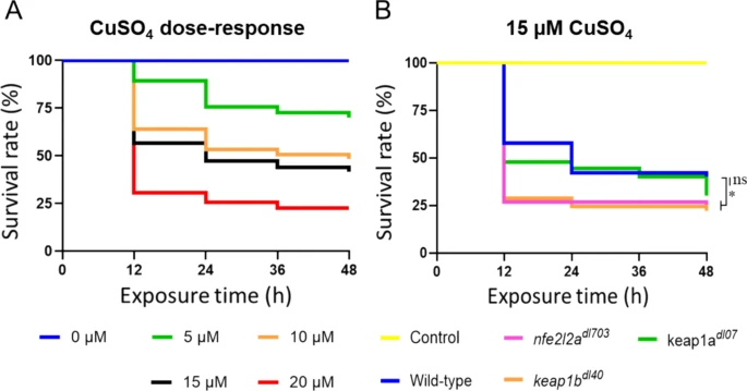 Fig. 4 Keap1b is critical for survival during CuSO₄-induced inflammation. A Dose–response curve for wild-type larvae exposed to different concentrations of CuSO4 (0, 5, 10, 15, 20 µM) for 48 h, used to determine the LC50 value of approximately 15 µM. B Survival curves of WT, nfe2l2a−/−, keap1a−/−, and keap1b−/− larvae exposed to 15 µM CuSO4 for 48 h. Note the extreme hypersensitivity of keap1b−/− and nfe2l2a−/− larvae, with survival rates plummeting to ~ 25%, indicating a specialized, non-redundant role for Keap1b in orchestrating a viable inflammatory response. In stark contrast, keap1a−/− larvae show survival rates comparable to wild-type, demonstrating functional divergence between the paralogs. Data are mean ± SEM (n = 3)